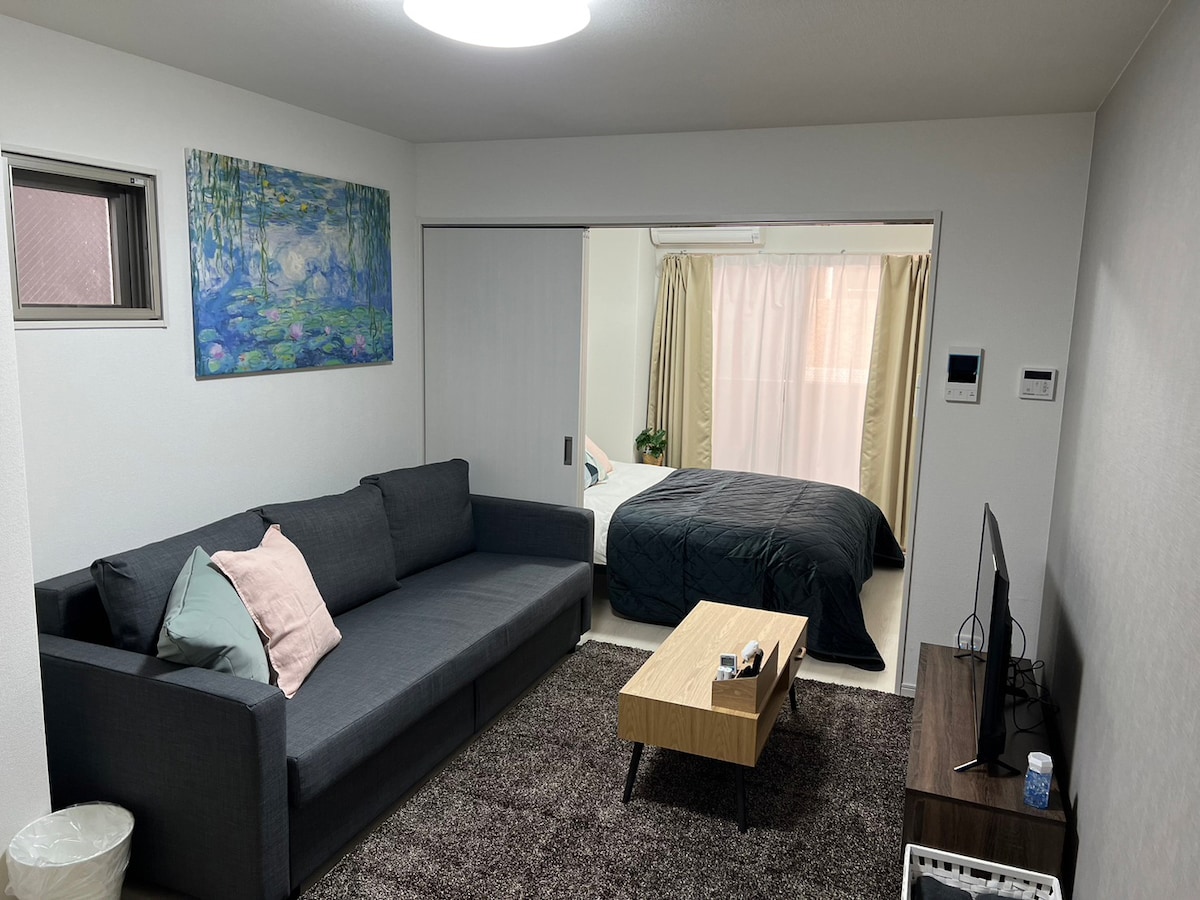 Charmerende, nyrenoveret lejlighed med to enkeltsenge kun 2 minutter fra JR Namba Station - Dotombori (8 minutter): Neonlys og streetfood venter. – Shinsaibashi (12 minutter): Shopping og spisning i et berømt kvarter. - Namba Yasaka helligdom (10 minutter): Ikonisk løveformet scene for historieentusiaster. - Kuromon-markedet (10 minutter): Friske skaldyr og lokale delikatesser. - Amerikamura (15 minutter): Trendy mode og hyggelige caféer. - OCAT (2 minutter): Et trafikknudepunkt, der gør det nemt at udforske byen.