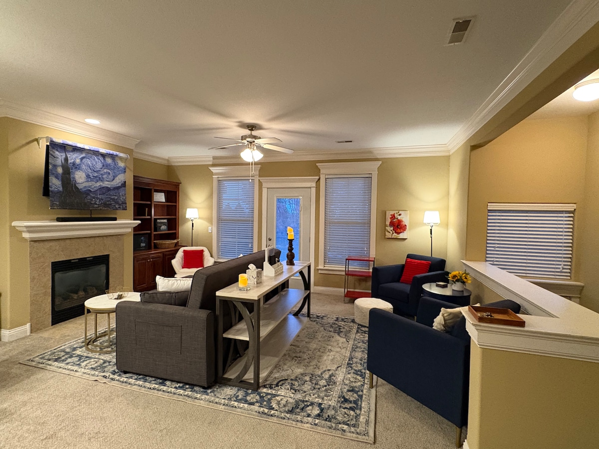 Dette 1177sf private byhus med 2 soveværelser og loft har kingsize-seng og 2 queensize-senge med alle Tempur-Pedic-madrasser. Det er bekvemt beliggende i nærheden af det populære shoppingdistrikt med nem adgang til større veje på tværs af byen og motorvejen. - Kun få blokke fra University of Kansas campus. - 5 minutters gang til Holcom Park og restauranter såsom McAlister's Deli, First Watch Breakfast, Buffalo Wild Wings og Chick-fil-A. - 15 minutters gang/5 minutters kørsel til Target, Walmart og mange flere.