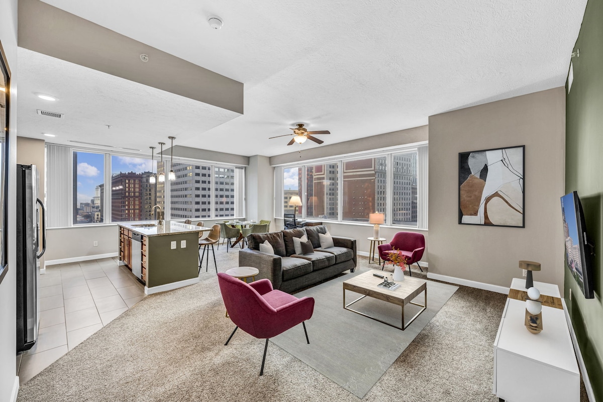 Velkommen til din bolig i Cleveland! Beliggende i en historisk bygning i hjertet af centrum, vil du føle byens charme, samtidig med at du har alle de moderne faciliteter, du har brug for. ➹ Rummeligt loft i downtown ➹ HURTIG 100mb Wi-Fi til arbejde eller streaming ➹ Fitnesscenter med sauna og solarie, der er åbent døgnet rundt ➹ Memory foam-senge, der giver en god nats søvn ➹ Smart-tv til dine yndlingsprogrammer ➹ Fuldt udstyret køkken Vi ELSKER virkelig at være værter og ønsker, at dit ophold i Cleveland skal være fantastisk – kontakt os, hvis du har spørgsmål.