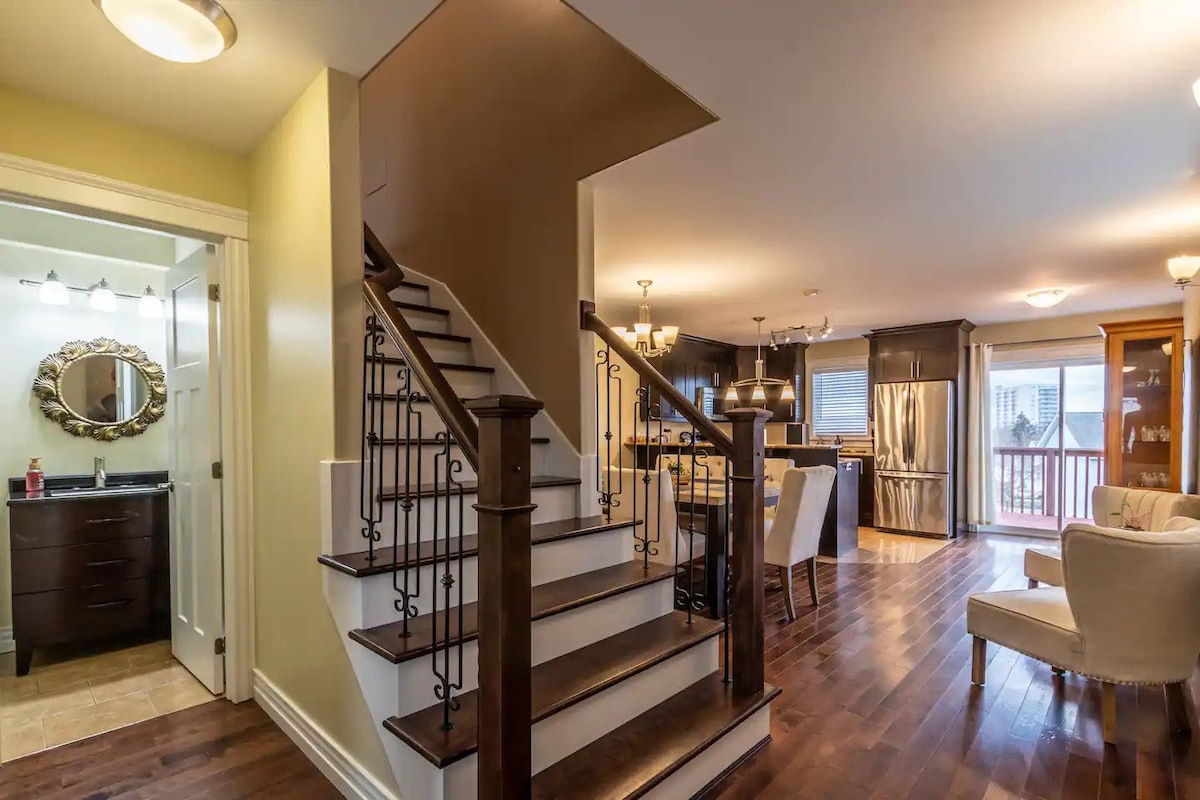 Velkommen til vores 2-etagers hus med 2 soveværelser plus et kontorlokale (samme som soveværelse), 2,5 badeværelser, åbent konceptdesign med komplet køkken og familieværelse plus gæsteværelse (sovesofa ud over almindelig sofa, der vender mod 65 tommer 4K TV). Dækplads med grill og siddepladser. Gåafstand til mange restauranter og shopping. 5 min kørsel til Halifax Shopping Center og strande, 10 min til Halifax centrum. Godt til fjernarbejde,