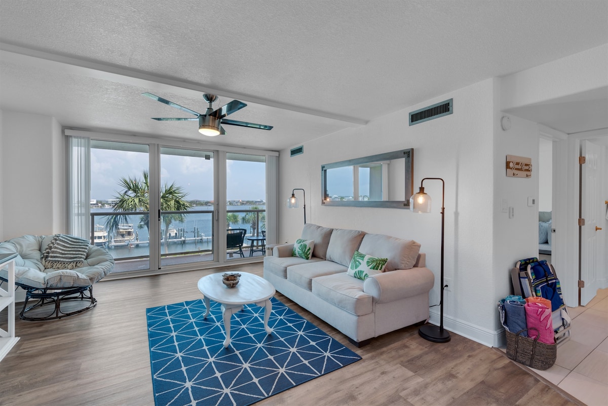 Come experience vacation paradise at "Sunshine Daydream" Located in the heart of Pensacola Beach. Perfect beaches, fantastic restaurants/bars, and shopping are only steps away. Enjoy pristine views of Little Sabine Bay from all over this magnificently renovated condo. Unwind on the 300 sq ft covered balcony and watch the sunset from the best location on the island! The complex hosts a large heated swimming pool, private beach, exercise room, dock, elevators, and a full time cleaning staff.