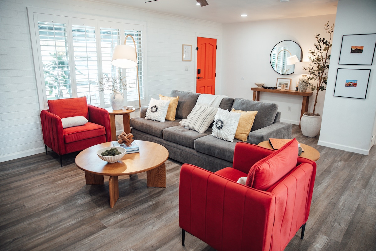 Velkommen til El Cinco! Beliggende i gåafstand fra alt, hvad Old Town Scottsdale tilbyder - de bedste af de bedste restauranter, caféer, barer/eller klubber, shopping (præcis 1,6 km fra Fashion Square-indkøbscenteret), gå- og cykelstier, vandreture og meget mere. Nyd dit ophold i hjertet af det hele. Lys og lyse boho-chic vibes. Hver rengøring har en 65-punkts tjekliste, så du kan være sikker på et pletfrit hjem. Skinnende pool, frodigt græs til kæledyr, nem adgang til alle dine aktiviteter. Vi vil rigtig gerne have dig!