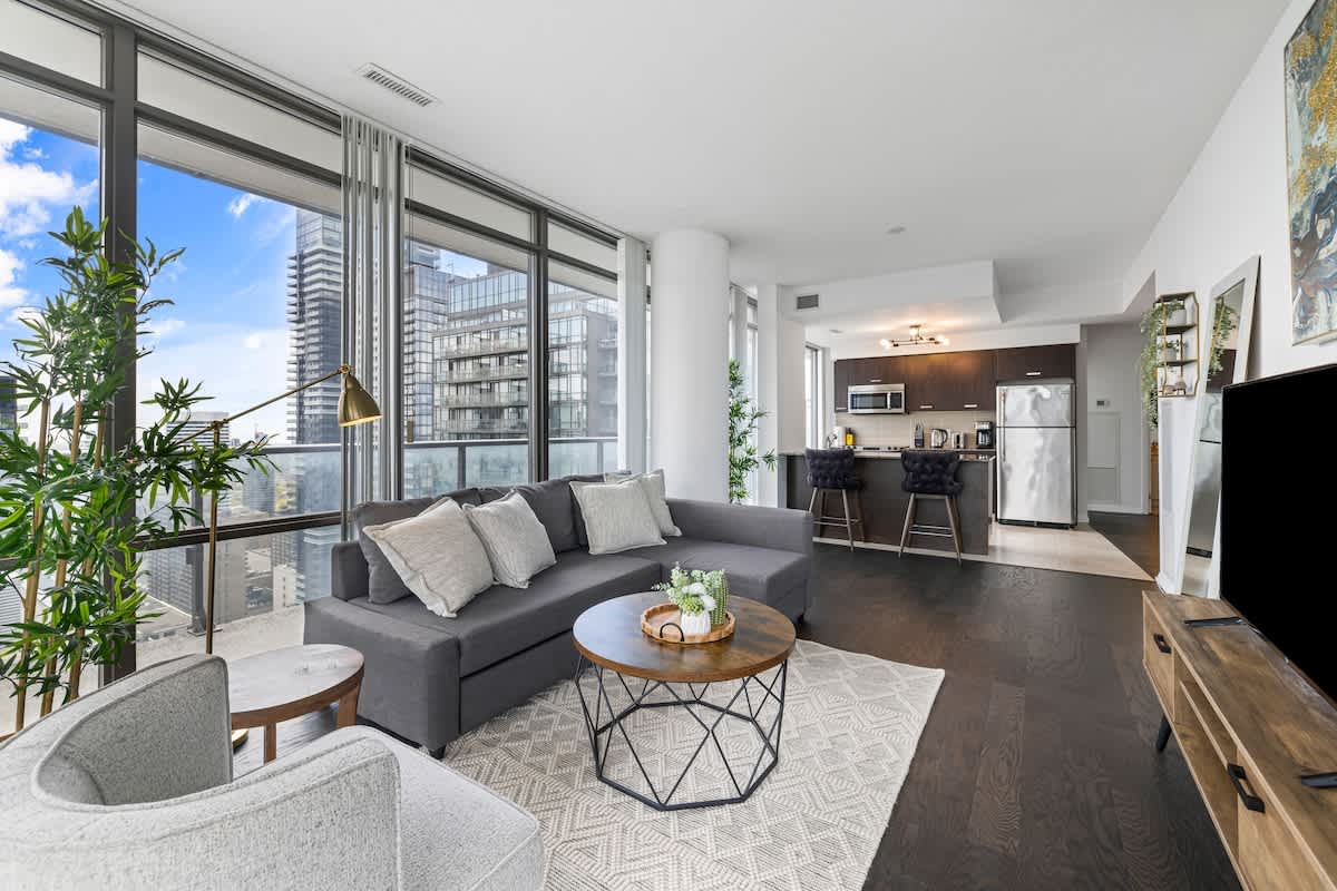 Stay in the heart of downtown Toronto in this modern one-bedroom condo just steps from the CN Tower, Rogers Centre, and the waterfront. The unit features a comfortable queen bed in the bedroom and a sofa bed in the living room, perfect for couples or small groups. Enjoy skyline views through floor-to-ceiling windows or relax on the private balcony. The condo includes a full kitchen, smart TV, high-speed Wi-Fi, and in-suite washer and dryer. Guests also have access to a gym and outdoor pool .