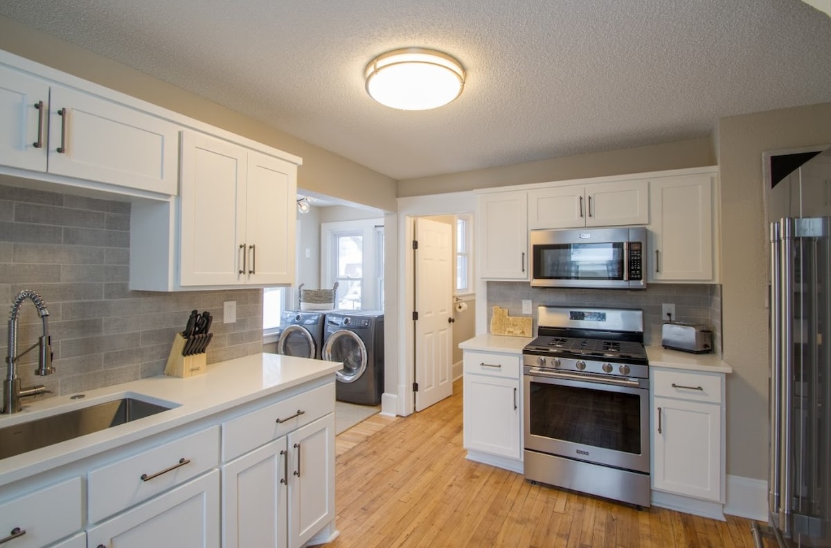 Smukt ombygget hjem i det historiske Northeast Minneapolis Arts District. Der er plads til seks personer, og du kan nyde moderne bekvemmeligheder, herunder bordplader i kvarts, nye hvidevarer i rustfrit stål, nyparket trægulv og en smuk terrasse. Bordet i bondehuset er det perfekte sted at samles og spille spil eller slappe af på sofaen i den tilstødende stue. Du vil bo i et roligt og sikkert beboelseskvarter, men stadig meget tæt på centrum (~2 miles).