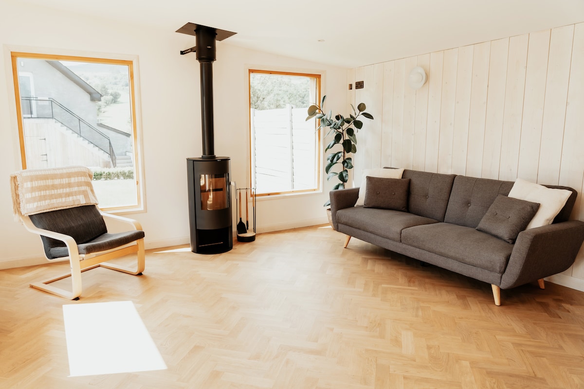 The Hen House er et finurligt, bølget Tiny House-fristed med et behageligt dobbeltsoveværelse, køkken og madlavningsfaciliteter, et privat spabad og dagslysattraherende gallerivinduer, der viser Sperrin-bjergene til absolut perfektion! Tilbring aftenen med at nyde udsigten, mens du slapper af foran den danske Morso-ovn, eller nyd de fælles Gin Tin-faciliteter med grill. Hønsehuset ligger bag vores familiebolig, Bancran School, i et roligt område.