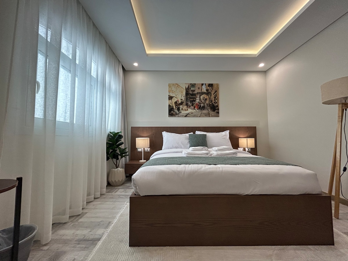استوديو فاخر بتصميم مودرن وأجواء هادئة، ideel til par og solorejsende. Nyd et luksuriøst studie med et fritstående badekar, moderne belysning og varme trædetaljer for et afslappende ophold. 📍 Fremragende beliggenhed nær City Stars Mall – Nasr City ✔️ Smart-tv ✔️ Hurtig wi-fi ✔️ Aircondition ✔️ Fuldt udstyret tekøkken ✔️ Arbejdsområde til fjernarbejde ✔️ Stueetage – nem adgang Perfekt til romantiske ophold, forretningsrejser eller korte byferier. Ren, stilfuld og privat.