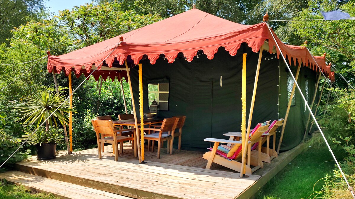 Unikt i Holland, indiske glampingtelte til en kongelig campingferie. Atmosfærisk glamping i en fem-personers Radjatent fra Indien. Teltets vægge er håndindrettet med gyldne frimærker. Loftet med stjerner med små spejle i. Bambuspinde, et myggenet og en luksuriøs hængekøje fuldender den eksotiske atmosfære. Sengene er redt, de dovne stole er klar, og om aftenen, når området er oplyst, kan der være et lejrbål.