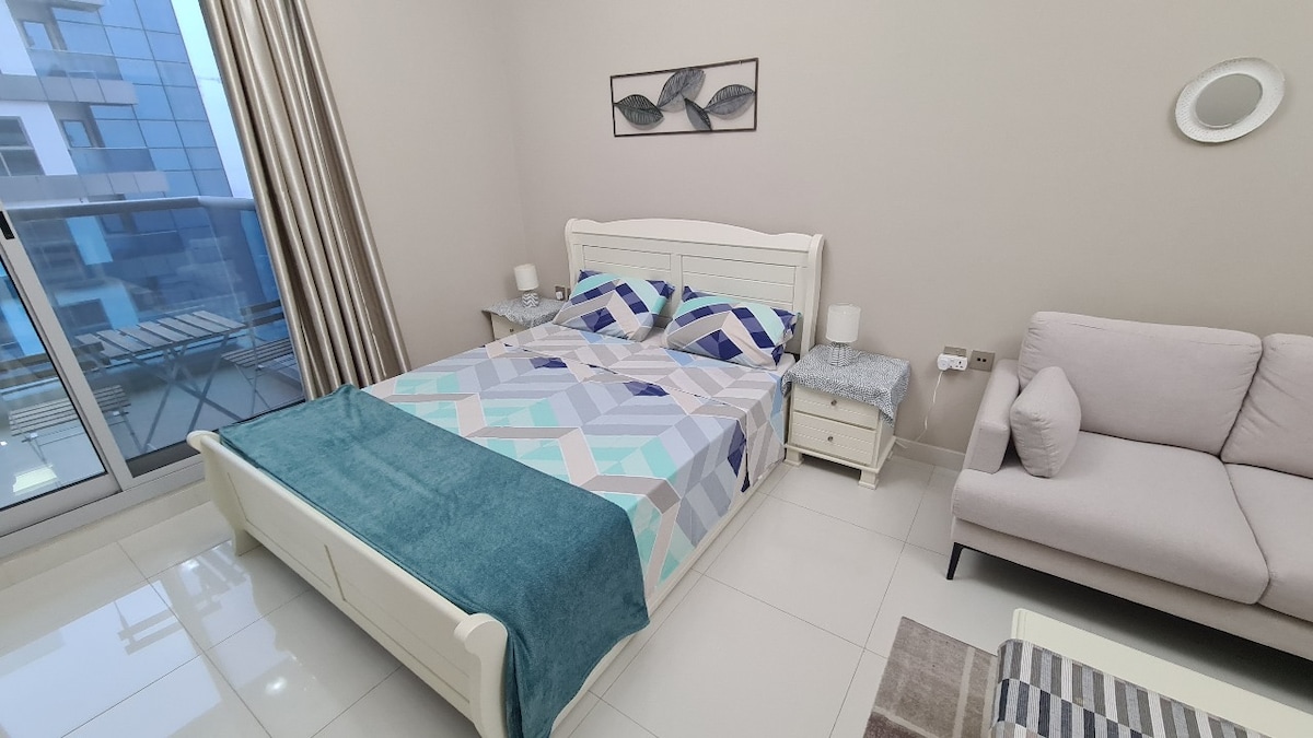 Velkommen til vores moderne 1-værelses Retreat — kun få skridt fra Circle Mall i Condor Concept 7, JVC! 🏙️ Kun to minutters gang til Circle 🛍️Mall. Perfekt til op til 4 gæster med et hyggeligt soveværelse🛏️, sovesofa🛋️, komplet køkken🍳, Smart TV📺, hurtig ⚡wi-fi og et elegant badeværelse🚿. Nyd pool🏊, fitnesscenter🏋️, sauna 🧖 og sikkerhedsvagt 24/7🛡️. Kun 15 minutter til Dubai Marina🌊, JBR Beach 🏖️ & Mall of the Emirates🛒. Book din JVC-ferie i dag. ✨📍