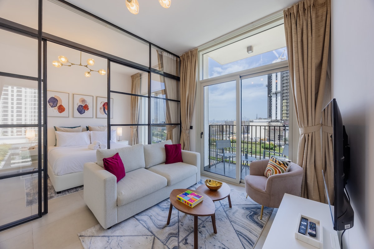 Chic Dubai Hills 1BD med udsigt over Burj