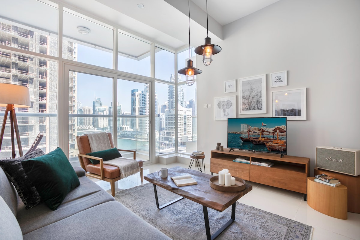 🌅 Fantastisk udsigt over marinaen fra balkonen! ✨ 2 minutters gang til Jumeirah Beach Residences togstation. Gå ud til Marina Walk, spadser til 🌊 JBR Beach eller udforsk 🌉 Bluewaters Island. Denne stilfulde lejlighed med 1 soveværelse er omgivet af caféer, restauranter og butikker og er det perfekte Dubai-ophold. 🏙️ Nyd moderne luksus, hyggelig komfort og fredelige vibes – uanset om du slapper af indendørs eller udforsker livlige omgivelser. 🌴 Dit perfekte ophold venter! 💫