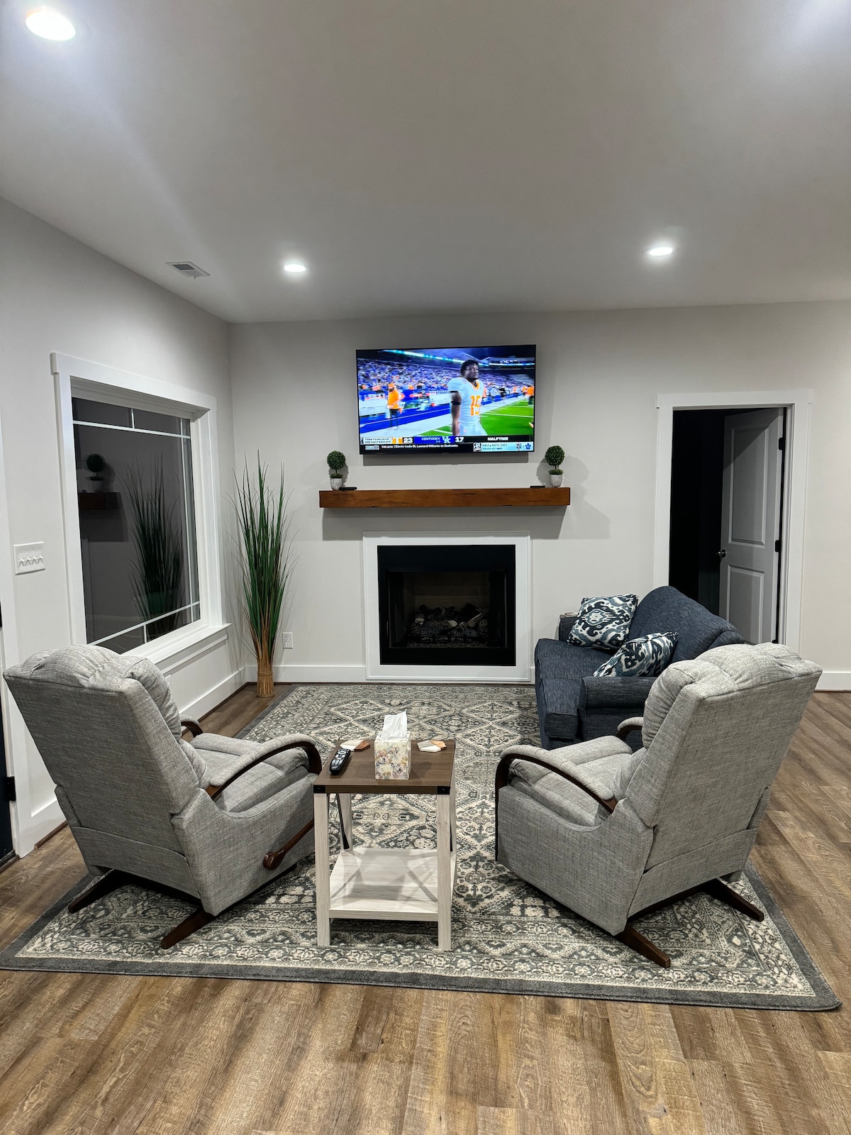 Nyd gårdoplevelsen eller en rolig udflugt i vores hyggelige hytte! Designet til maksimal hygge på kun 192 kvadratmeter, er det det perfekte sted at komme væk. Selvom den er designet til to, kan vi levere en ekstra dobbeltmadras. Tekøkkenet har et kompakt køleskab/fryser, mikrobølgeovn og kaffemaskine. Queensize-sengen ved siden af pejsen er det perfekte sted at se en film eller læse en bog eller nyde kaffe og solnedgange fra gyngestolene på den omgivende veranda. Vi ses forhåbentlig snart!