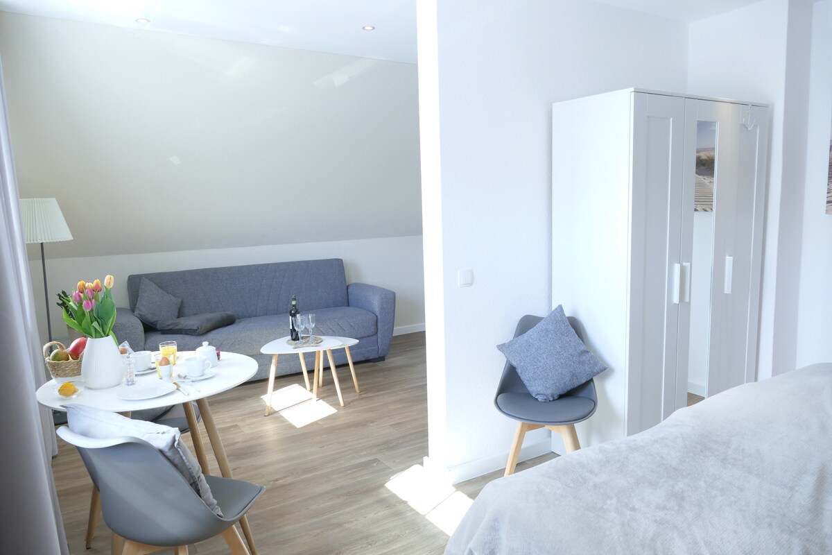 Verbringe erholsame Tage in unserer modernen Dachgeschoss-Ferienwohnung im Haus Bärbel in Duhnen – nur wenige Minuten vom Nordseestrand entfernt. Ideal für Paare oder Freunde. Dich erwartet ein gemütlicher Schlafbereich für 2 Personen, eine voll ausgestattete Küchenzeile, ein Bad mit Fußbodenheizung, WLAN & Smart-TV sowie ein kostenloser Parkplatz direkt am Haus. Perfekt für Strandtage, Radtouren und entspannte Auszeiten am Meer. 🌊