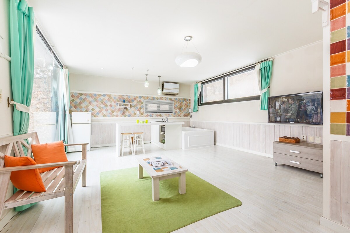 # 1 minuts gang fra hovedporten til Gapyeong Morning Calm Garden #Spa med boblebad #Beam-projektor # Netflix tilgængelig med tv og projektor (personlig konto påkrævet) # Individuel kulgrill (campingtype, indendørs type) #Bålplads #Udendørs fælles swimmingpool (brugsperiode: maj til september afhængigt af vejret) # Håndklæder fra værelserne må ikke bruges i swimmingpoolen # Strandtørklæde skal forberedes separat # Badetøj, udslætsbeskyttelse, sportstøj til rådighed, bomuld ikke tilladt #Mart-adgangsafhentning til rådighed #Ingen elevator (der er mange trapper, så se den, når du foretager en reservation.) # Du kan få flere oplysninger på Romang Pensions hjemmeside