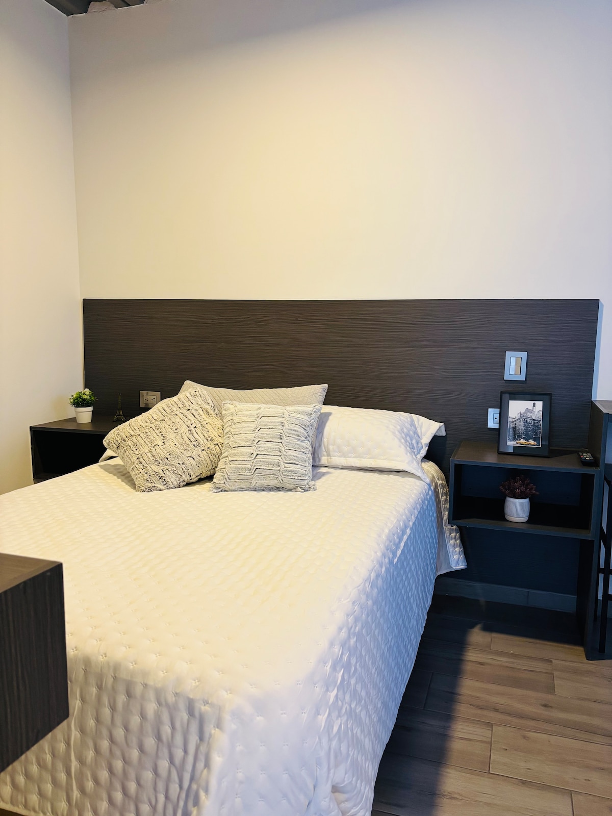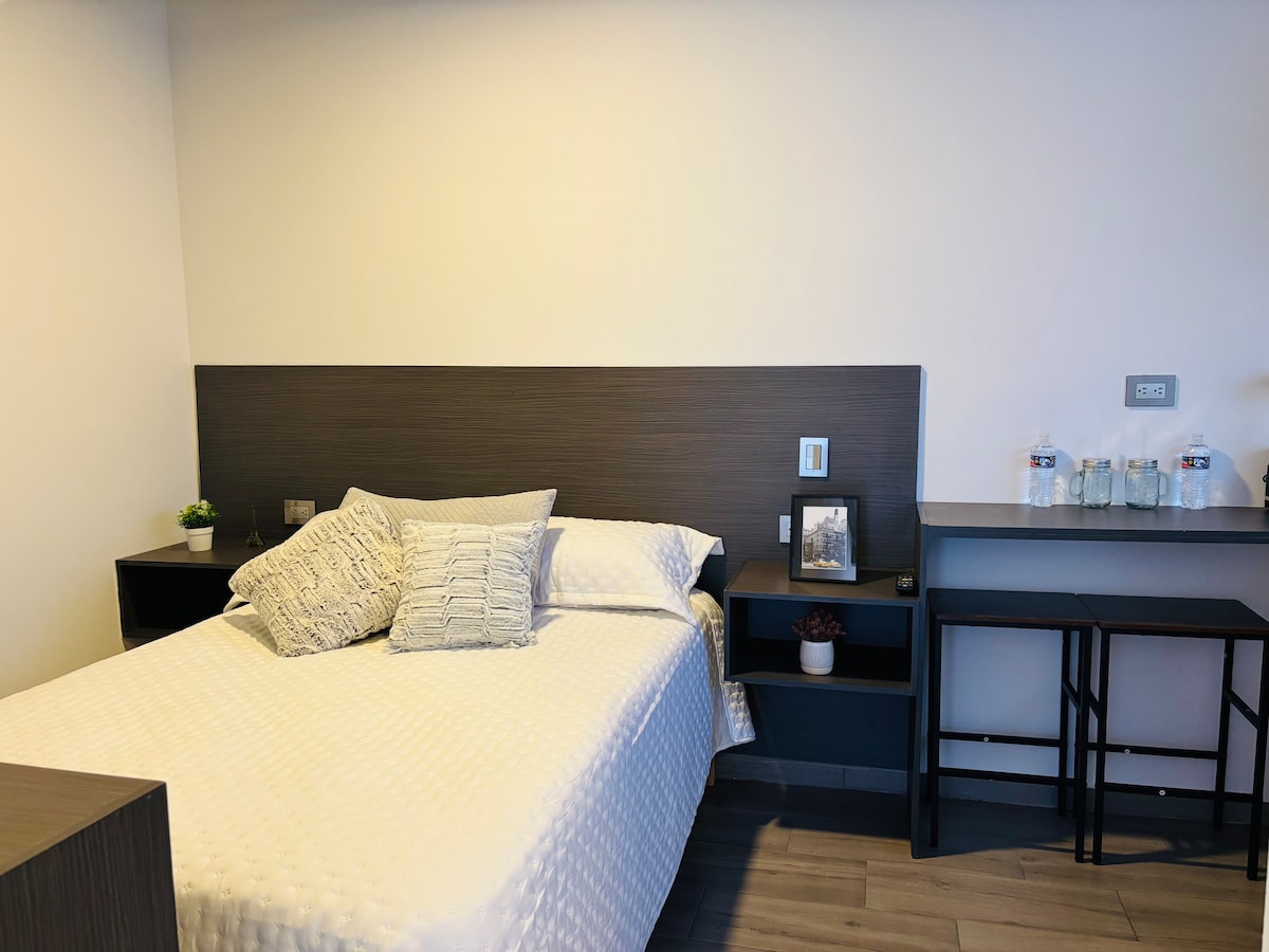 Slap af i dette rolige og elegante rum. Hyggeligt helt soveværelse til to personer. Den har Smart TV og Netflix, Disney +, wifi, gratis parkering, varmt vand 24/7, køkkenudstyr, køleskab, gasgrill, mikrobølgeovn, drikkevand, i et privat boligområde med 24-timers overvågning. På tredje sal i et af de bedst beliggende og forbundne områder i byen. Beliggende ved siden af supermarkeder, restauranter og indkøbscentre.