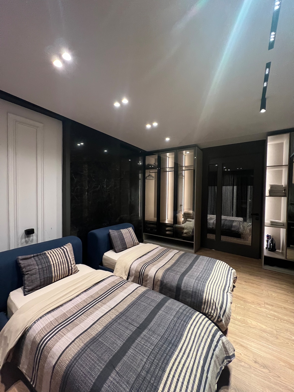En helt ny lejlighed med et skønt og afslappende design, der får dig til at føle dig hjemme. Lige ved siden af den nye basar, 6 minutter til centrum. Nær Toptani indkøbscenter, regeringsbygninger, museer, opera, medicinsk center. 110 m2 lejlighed, 3. sal med elevator, fuldt møbleret, har 1 soveværelse (dobbelt seng) 1 soveværelse (2 enkeltsenge), køkken (ovn, opvaskemaskine osv.) rummelig stue, 2 toiletter, gratis parkering inkluderet. Tv, aircondition i alle værelser, opvaskemaskine, vaskemaskine.