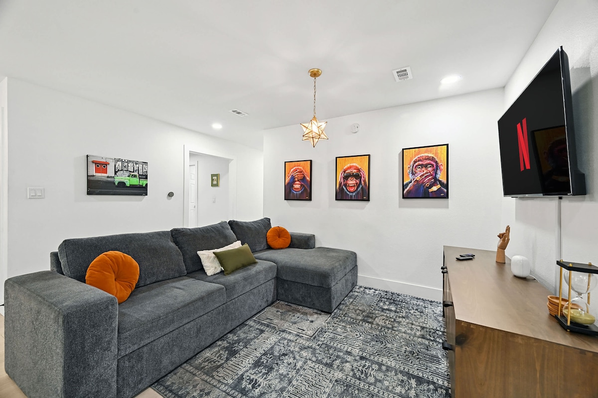Velkommen til Penthouse Townhome på Inn Cahoots – et privat luksussted med 11 senge i Austins mest pulserende spillested. Den er designet til den ultimative Austin-oplevelse og har et komplet køkken, åbne stue- og spisestueområder og fire rummelige soveværelser – perfekt til sammenkomster eller forretningsrejser. Gå udenfor, og oplev, hvordan stedet kommer til live med levende musik, madvogne, pop op-grillsteder og en tagterrasse.