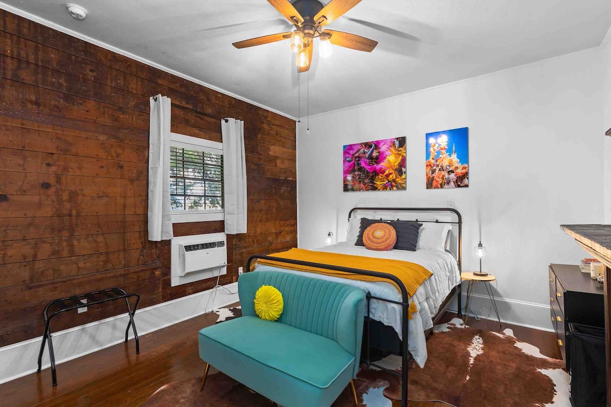 Nyrenoveret med boutique-hotelværelsesfinish. Denne enhed ligger i en bygning fra midten af 1800-tallet, der vender ud mod en afsondret gårdhave, to blokke fra delstatens hovedstad i Historic Spanish Town. Gå overalt - spisning, drikkevarer og seværdigheder. Fuldt køkken og vaskemaskine i boligen. Elbil: ChargePoint niveau 2 NACS-oplader tilgængelig. CCS1 og J1772 skal bruge deres egen adapter. Parkering på stedet til en bil. Kingsize-seng, to stole, der kan laves om - fantastisk til børn! Babyudstyr og cykeludlejning til rådighed!