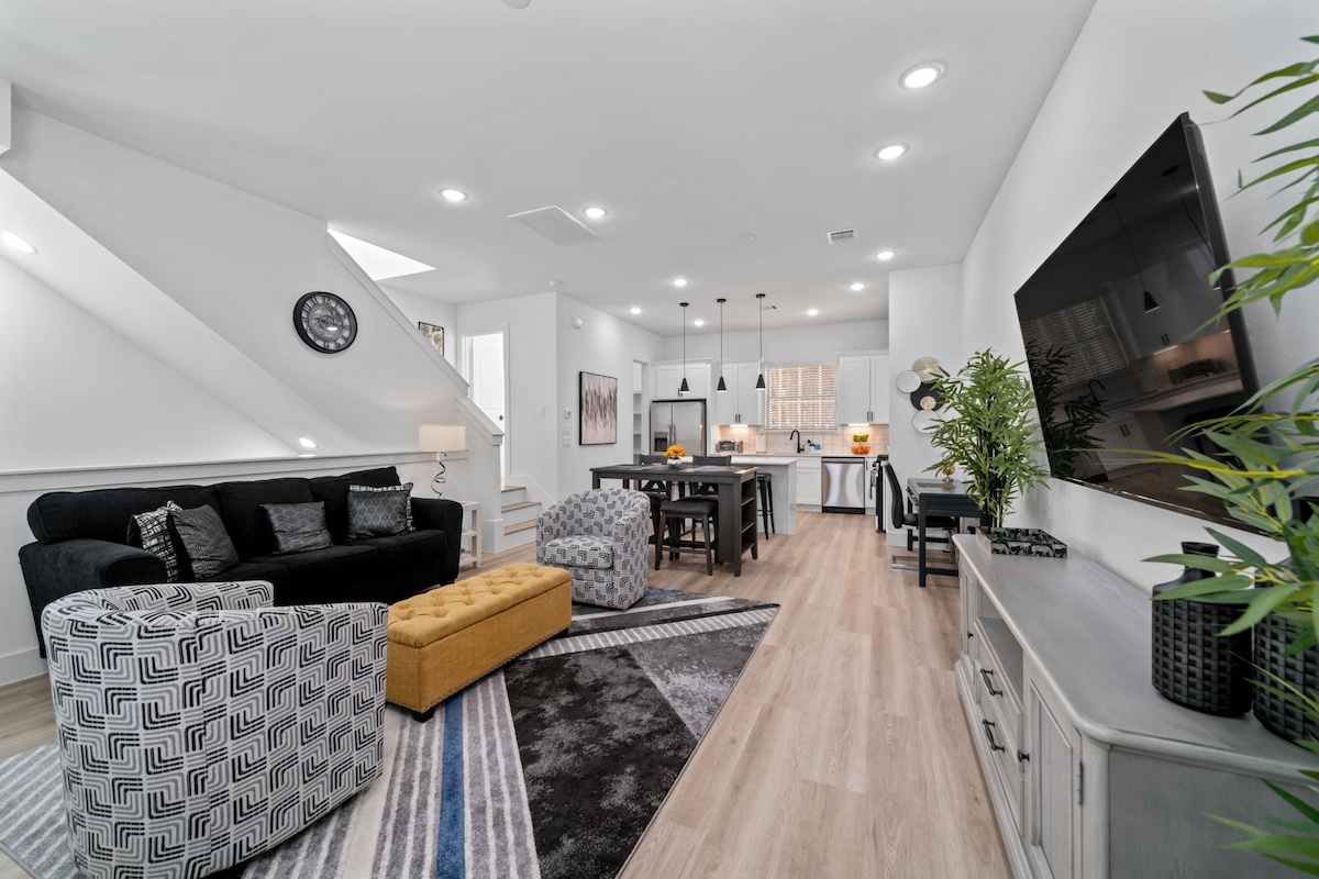 Dette moderne og elegante byhus er perfekt til grupper eller familier og kan rumme op til 10 gæster. Med 3 rummelige soveværelser, 3,5 badeværelser og 5 senge er der masser af plads til at slappe af. Den åbne stue er stilfuldt møbleret, hvilket skaber et indbydende rum, hvor alle kan samles. Beliggende kun 5 minutter fra downtown Houston, vil du være inden for gåafstand til de bedste restauranter, barer og underholdning, byen har at tilbyde.