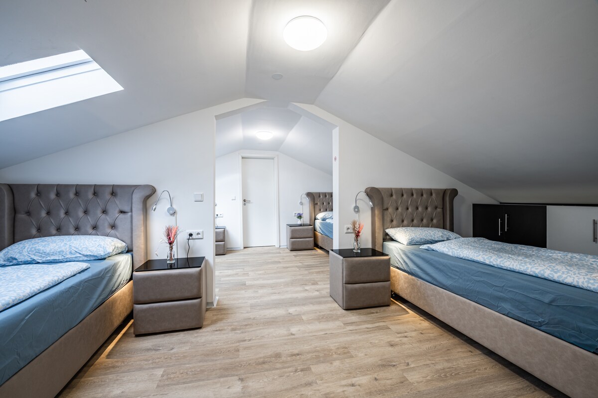 Rummelige lejligheder til store grupper og familier. Vores nye 1- til 5-værelses lejligheder, suiter og loftslejligheder med særligt design og atmosfære venter dig på det idylliske klimaanlæg Hage, kun et par minutters kørsel fra Nordsøen og tæt på Lütetsburg golfbane. Nyd et rummeligt og moderne værelsesdesign med en blanding af materialer af høj kvalitet og noble farver. Gratis højhastigheds W-Lan og tv fladskærme. Egen parkeringsplads ved huset.