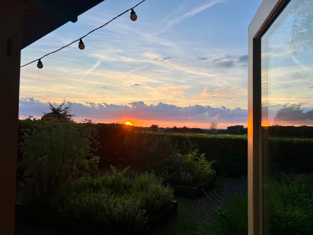 Unik, rummelig og fredfyldt. Et ideelt fristed, hvor du kan slappe af og komme væk fra det hele. Smukke solrige lukkede sensoriske urtehaver med en hængekøje og boende slørugler. En mark med vandresti og sommerhus. Udsigt over landet, åben Norfolk-himmel og fantastiske solnedgange. Eftertragtet landsby nær Royal Norwich Golf Clubs bar og restaurant. En kort gåtur til en populær kæledyrsvenlig landsbypub. Nem kørsel til kyst/strande, Norfolk Broads og Norwich. Vandreture, cykling, fiskeri, svømning og golf.