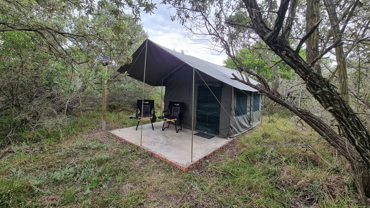 En afsondret, sikker teltlejr, der ligger fem minutter fra St Francis Bay. Et stort og to mindre "hær" -telte ligger mellem den indfødte busk med udsigt over en lille dam. Alle telte har lys og stikkontakter, der er kraftige nok til små apparater såsom bærbare computere og telefoner (bemærk, at apparater med høj watt såsom hårtørrere ikke virker). Toilettet og bruseren er designet på en måde til at indarbejde naturen i dit ophold. Husk, at bushbuck strejfer rundt i lejren, ingen kæledyr, og tag en fakkel med!