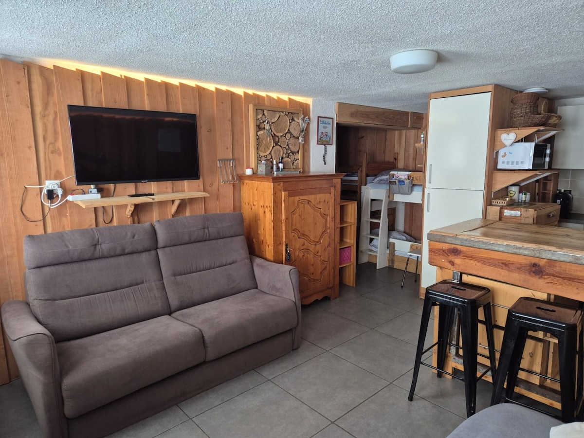 Moderne lejlighed med sydvendt balkon – tæt på skiløjperne Nyd et ekstraordinært ophold i denne fuldt renoverede studio i hjertet af feriestedet. Denne lejlighed er ideel til fire personer og kombinerer komfort og modernitet. Dens virkelige aktiv? En sydvendt balkon med fantastisk udsigt over bjergene og skråningerne. Beliggende tæt på butikker og snefronten, alt er inden for gåafstand. Der er også en privat skikælder, så opholdet er sikkert.