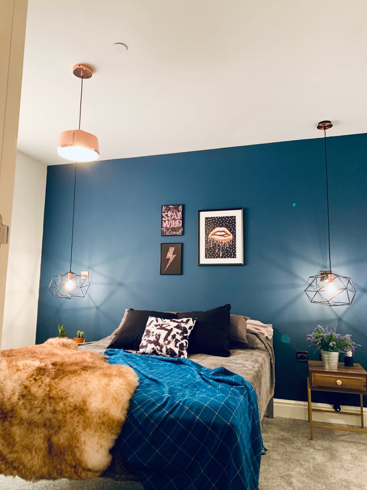 Soveværelse med dobbeltseng og dedikeret stort badeværelse