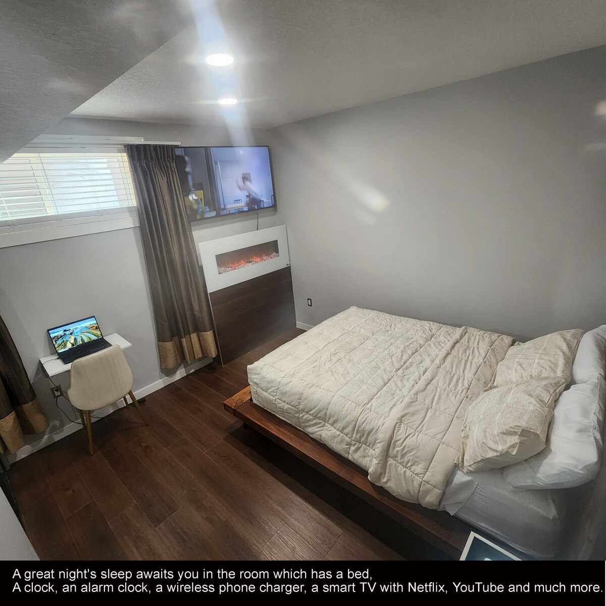 Close to Anthony Henday. Located in a great neighborhood with shops and dining options nearby. Offering all the comforts you need for your stay. Enjoy modern amenities, a fully equipped kitchen, a large living room w/smart TV, a fireplace, a modern bar. Incredibly beautiful sofa with seat power. A dream bedroom with special and natural wood frame, modern night stand w/ wireless charger/ USB/ USC ports. fireplace and smart tv in your Spacious and modern bathroom with LED mirror. No stair.