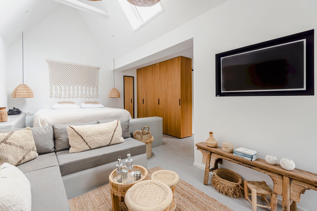 Suite-Suite er et fritliggende, trendy og luksuriøst privat gæstehus med gratis parkering på privat ejendom, privat terrasse med overdækket terrasse, beliggende kun 5 minutters gang fra strand, klitter og centrum. Suite-Suite er det ultimative sted at slappe af. Gulvvarme og aircondition sikrer, at det er behageligt at bo her på alle årstider. Det smukke cementstuckgulv, sofaen og Suite-Suite-drømmesengen gør dette ophold til en unik oplevelse ♡