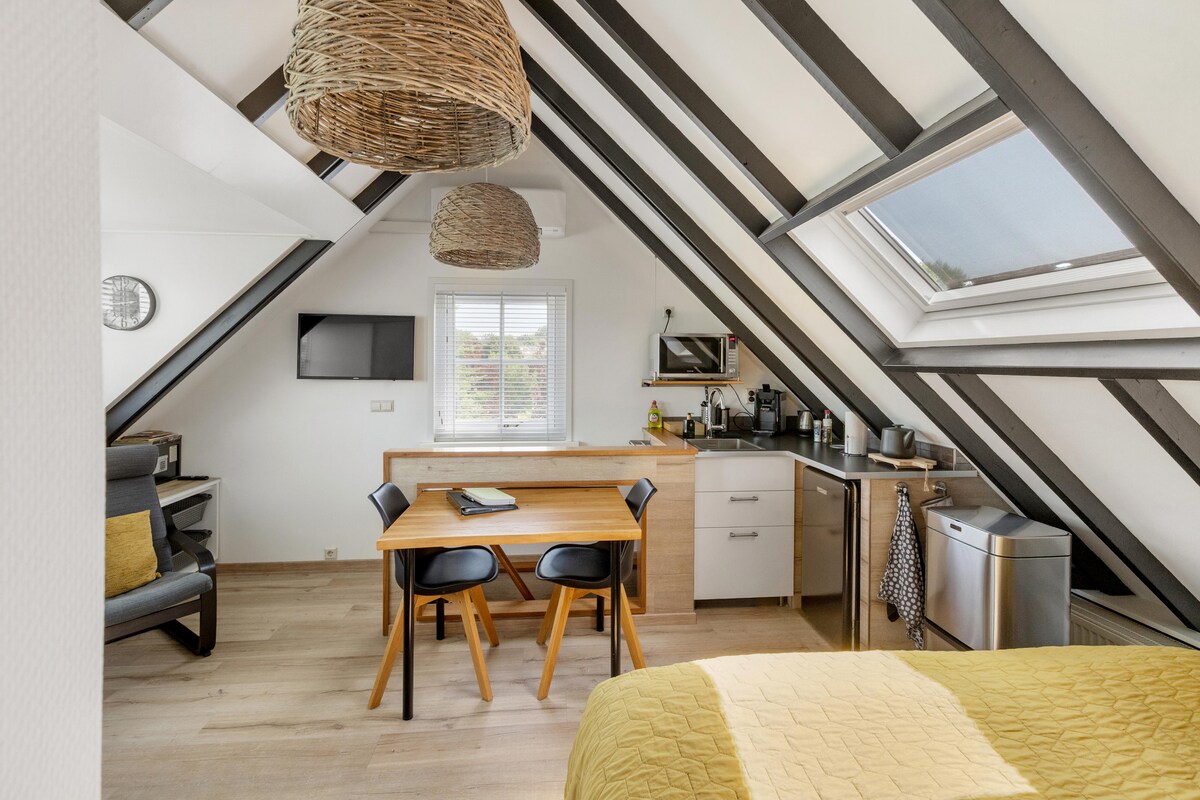 Denne smukke lejlighed ligger over garagen med egen indgang under carporten. Studiet har en eventyrlig udsigt over møllen og markerne bag huset. Du kommer ind i atelieret via trappen. Her kan du finde en hyggelig moderne atmosfære. Du er helt privat i lejligheden. Bag lejligheden har du din egen private terrasse med 2 stole og et bord. Ved vandet finder du to afslapningsstole. Du kan parkere din bil ved møllen. Cykler kan sættes under carporten.