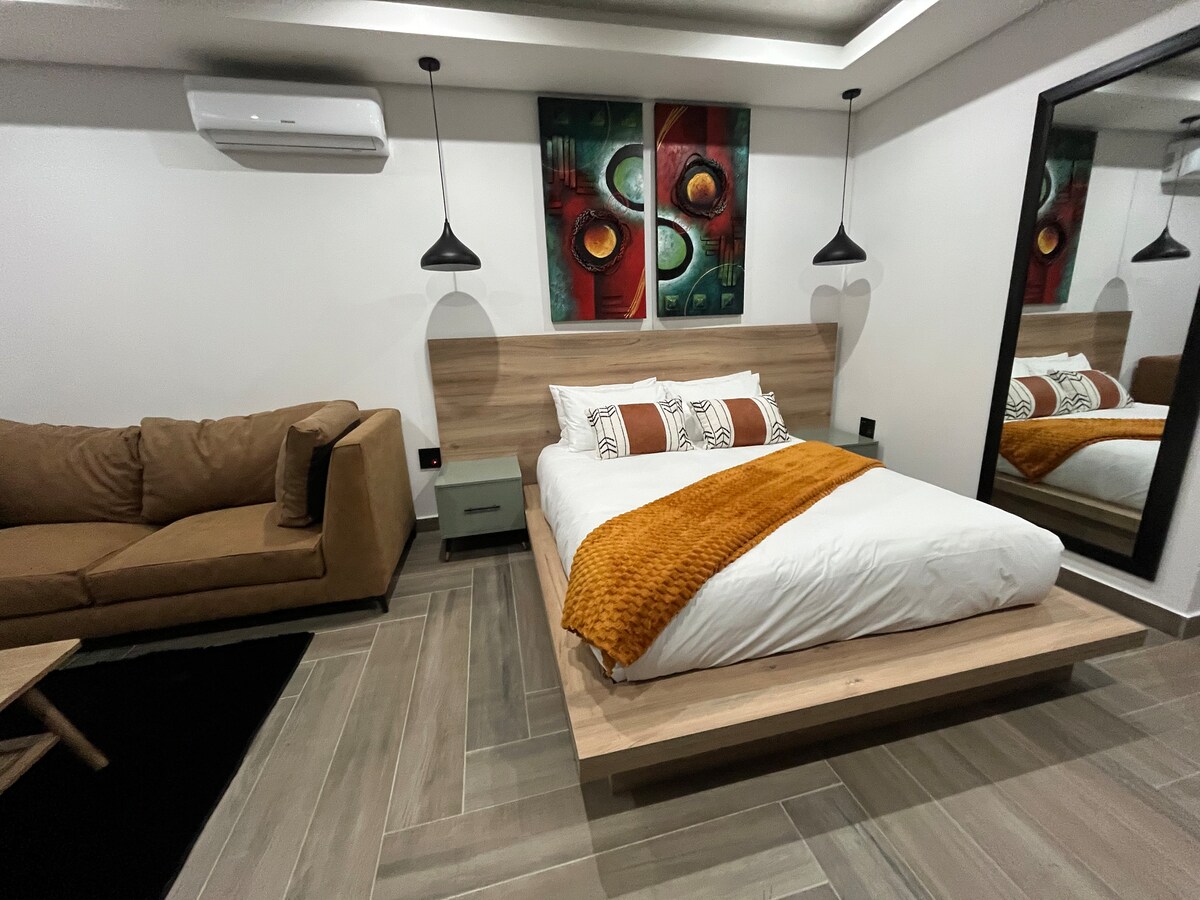 Oplev komfort og stil i denne lyse, moderne lejlighed, der er perfekt til par, forretningsrejsende eller små familier. Med masser af naturligt lys tilbyder det en afslappende atmosfære. Et stilfuldt, luftigt design med store vinduer, der giver naturlig lysstyrke Lav nemt mad ved hjælp af et komfur, en ovn, et køleskab, en mikrobølgeovn og alt nødvendigt køkkengrej. Har en sovesofa, der er perfekt til ekstra gæster og et smart-tv til underholdning. En queensize-seng med førsteklasses sengetøj og rigelig skabsplads.