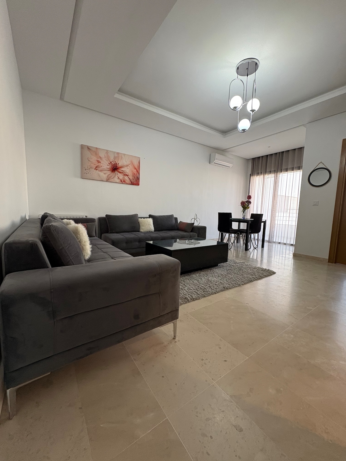 Moderne lejlighed på 5. sal med elevator, beliggende i L'Aouina, få minutter væk: ° Fra Tunis-Carthage Lufthavn ° Fra centrum ° Strande, sø og Marsa Kvarteret er et boligområde, det er fuld af restauranter, caféer, butikker... alt sammen inden for gåafstand. 🅿️ Privat og sikker parkeringsplads til rådighed Nem 🅿️ parkering på eller i nærheden af gaden.
