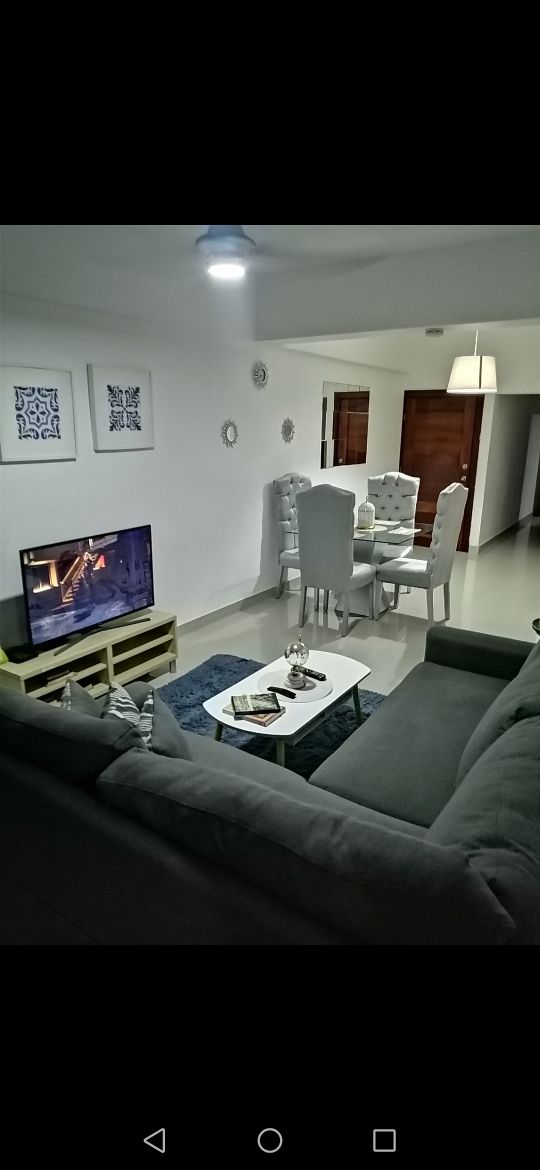 "Moderne lejlighed i luksus lejlighedsbygning, i et meget sikkert område. Lejligheden har seng, køleskab, komfur, brødrister, elektrisk kaffemaskine, vaskemaskine, tørretumbler, køkkenredskaber, to (2) klimaanlæg i stuen og soveværelset. En overdækket parkeringsplads og to fjernsyn med YouTube og Nexflix" Lejligheden har elektrisk dør, et imponerende socialt område, fitnessrum og mødelokale