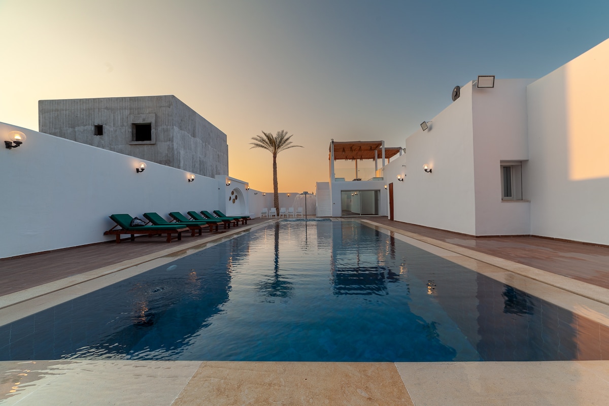 La Perle Blanche – Spacious and bright private villa with a pool and rooftop, ideal for a peaceful stay as a couple or with family. It offers an elegant, comfortable and relaxing setting, designed to fully enjoy Djerba. Located in a sought-after area, the villa combines privacy, generous space and close proximity to the island’s main points of interest. Everything has been thoughtfully arranged to ensure a smooth and enjoyable stay, whether for a few nights or a longer holiday.