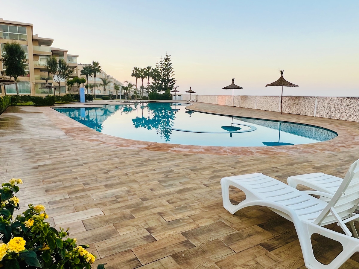 Solbeskinnet panoramisk lejlighed med terrasse mod havet og lille privat pool. Master suite med tv og badeværelse. Andet soveværelse med adgang til terrassen. Andet badeværelse. Komfortabel stue, 50" TV, Netflix og Wi-Fi, udstyret køkken med bar, central aircondition. Indhegnet og sikker bolig med parkering og garage. Stor fælles swimmingpool, der er åben hele året. Cherrat og Bouznika strand kun få minutter væk. Absolut ro. Ideel til familier og par.
