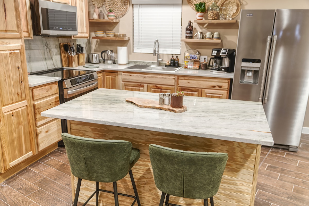 Eksklusivt NW El Paso-studie med gratis Tesla-opladning. Dette private, hundevenlige fristed har et hjemmegym, dedikeret skrivebord og hurtig wi-fi. Slap af i cognacfarvet lædersofa med et kæmpe 75" tv. Gourmetkøkkenet har bordplader i kvartsit til hjemmelavede måltider, og en vaskemaskine/tørretumbler i boligen gør lange ophold problemfrie. Nyd den fælles baghave med grill og basketballring, eller gå 7 minutter til hundeparken. Kaffestation: Bryg, K-Cup og espresso. Oplev den ultimative balance mellem arbejde og leg i din ørkenoase.