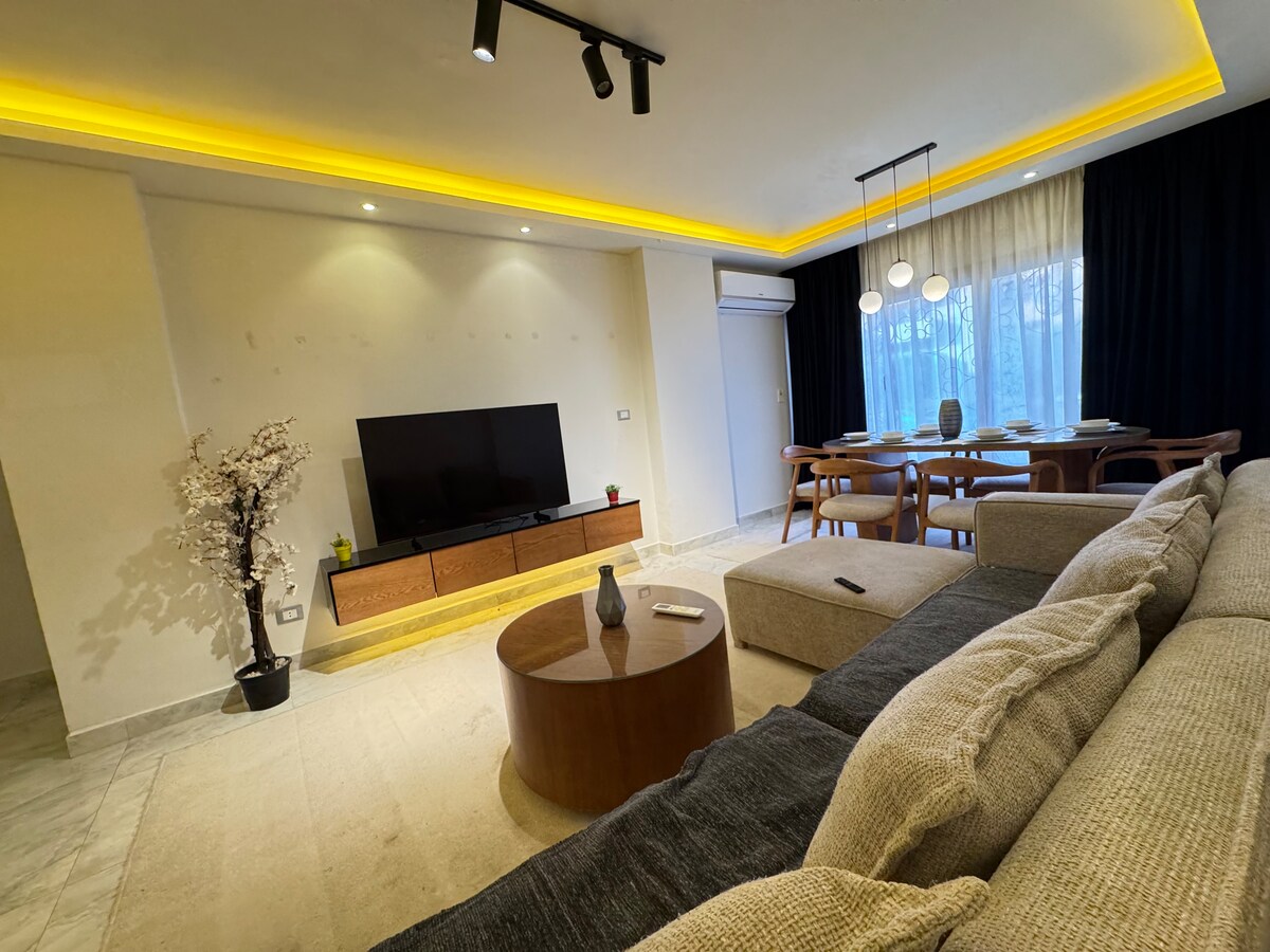 Velkommen til denne moderne lejlighed med to soveværelser, der er perfekt beliggende i centrum af New Cairo og tilbyder en uovertruffen kombination af komfort, bekvemmelighed og stil. Denne lejlighed er et fremragende valg for familier, små grupper eller forretningsrejsende, der søger et hyggeligt og godt forbundet sted til deres ophold.