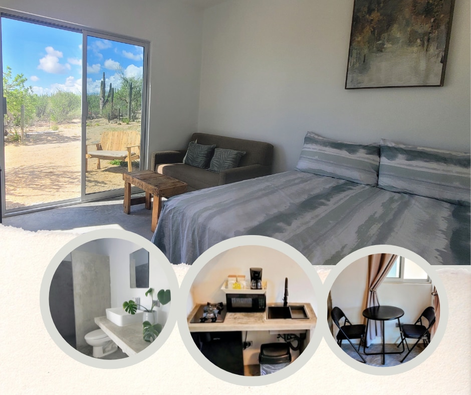 A Great Studio Apartment for couples or solo travelers. Eco-Friendly, Off Grid, equipped with hot shower, kitchenette, ceiling fan, & fast Starlink WiFi for working remotely. Work & unwind in this quiet retreat just 10 minutes from town, beach, kite spots and restaurants. Surrounded by the Cardón forest, away from the noise. Enjoy lively dinners in the patio with Epic views of the Sea of Cortez. Watch the sunrise from bed or your private patio, then stargaze beneath Baja’s clear night skies.