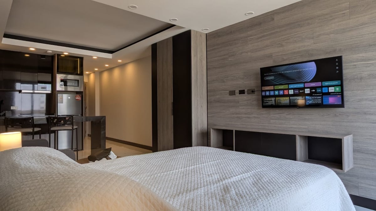 Este lugar único es nuevo, elegante, cómodo y con mucho estilo. Tiene todo lo que necesitas ya sea para estadías largas o cortas. El edificio fue finalizado en Diciembre de 2024, tiene piscina, gimnasio, co work, mesa de billar y futbolín entre otras amenidades. Ubicado en corazón de Equipetrol cerca a varios restaurantes, cafeterías y tiendas.