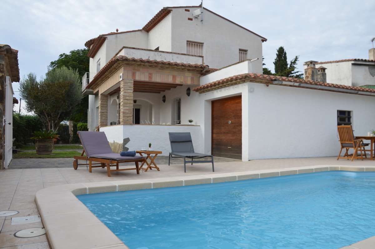 Charmerende hyggeligt og komfortabelt hus, meget veludstyret, i et roligt område, swimmingpool , indhegnet grund, elektrisk port, parkering til to biler, aircondition, overdækket terrasse, grill. Hovedsoveværelse ovenpå med BADEVÆRELSE og privat solariumtoilet, aircondition Stueetagen, udstyret køkkenopvaskemaskine osv. tv-sovesofa 2 soveværelser med skabe og aircondition 1 separat toilet Badeværelse med bruser og håndklædetørrer stue café, supermarked, restaurant, bageri, 2 minutters gang fra huset...