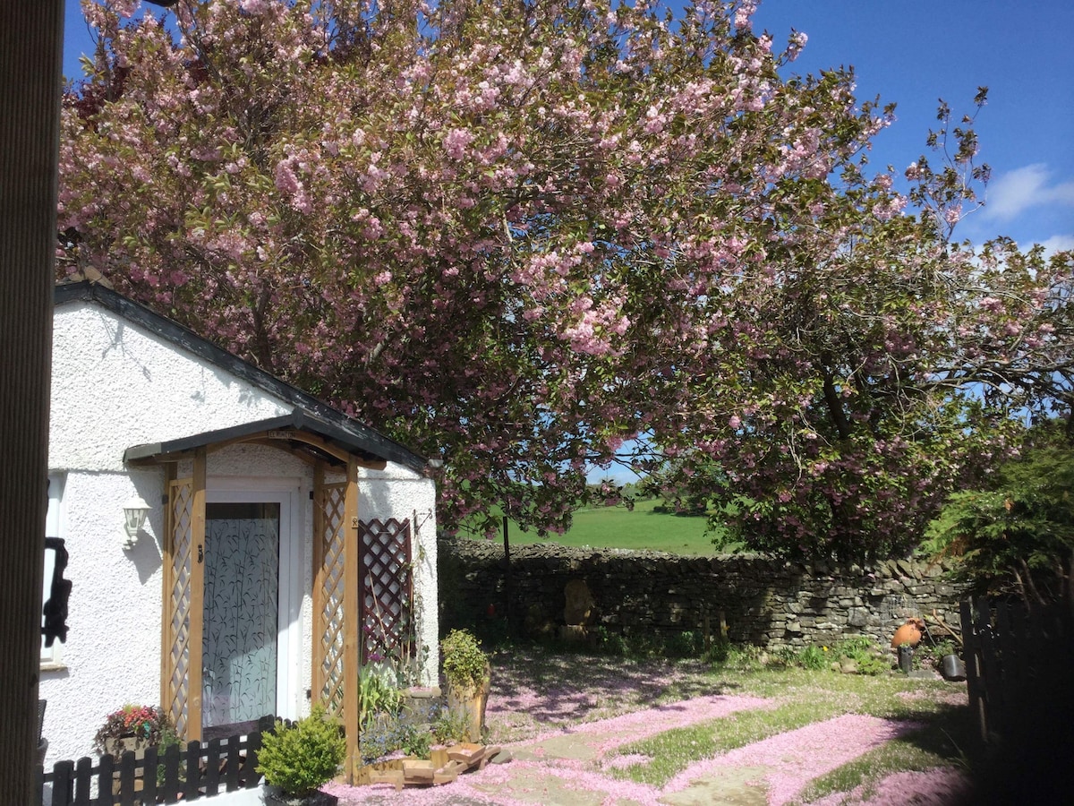 Charming spacious , good sized kitchen, shower room and bedroom/sitting room (sleeps 2, in a king size bed) area looking out over the garden with beautiful views over fields and Lake District Fells walking distance to our local pub, farm shop and national trust property Sizergh castle, 10 min drive to Kendal, 20 min Windermere, 15 min kirby lonsdale, 17 min cartmel racecourse. We are spoilt with the amount of restaurants/country pubs which all serve amazing food