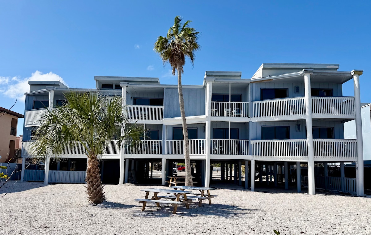 Denne lejlighed med 2 soveværelser og 2 badeværelser ligger lige ved stranden og er kun 10-15 minutters gang til alt, hvad Manasota Key har at tilbyde! Helt ombygget i 2024. Denne lejlighed har plads til 6-8 gæster. Det store soveværelse har en kingsize-seng, der er 2 queensize-senge i gæsteværelset og 2 store sofaer, der kan rumme 2 gæster. Køkkenet er udstyret med alt, hvad du har brug for til dit ophold! Alle vinduer er helt nye og orkanbestandige.