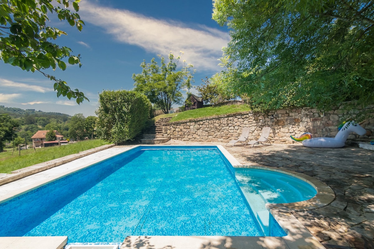 Landlig hytte lavet af sten og skifer tag, original fra området med uovertruffen beliggenhed og udsigt, den har en privat eg- og kastanjeskov med sit eget picnicbord og en omfattende gård at gå på i et uforligneligt miljø, 2 etager, 3 værelser et af dem med sofa og tv, grill - udendørs pejs, vandbrønd, overdækket veranda, terrasse - balkon, udsigtspunkt - stenterrasse ophængt på bakken med en fantastisk udsigt over dalen og bjergene samt hele huset.