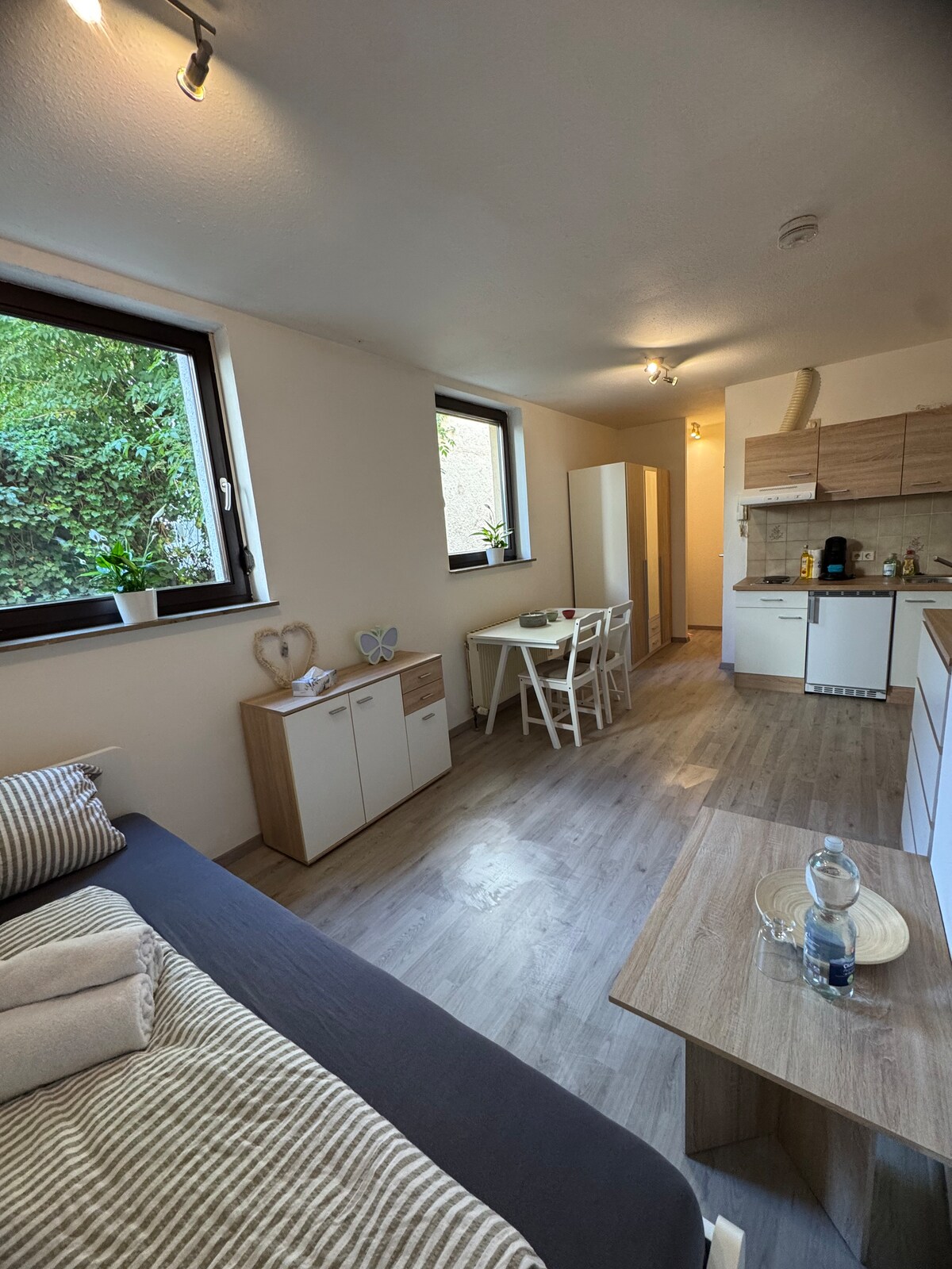 Vores fine kælderlejlighed har et lille tekøkken i gangen. Dette er ikke egnet til mad stegt i olie. Et brusebad og et dejligt soveværelse med en boxspring-seng og et stort fladskærms-tv. Wi-fi, lydisolerede vinduer, meget god beliggenhed mellem Friedrichsau og byens centrum, Rewe, Lidl og busstoppested 100 m væk. Downtown ligger 15 minutters gang derfra. Privat adgang til baghaven.