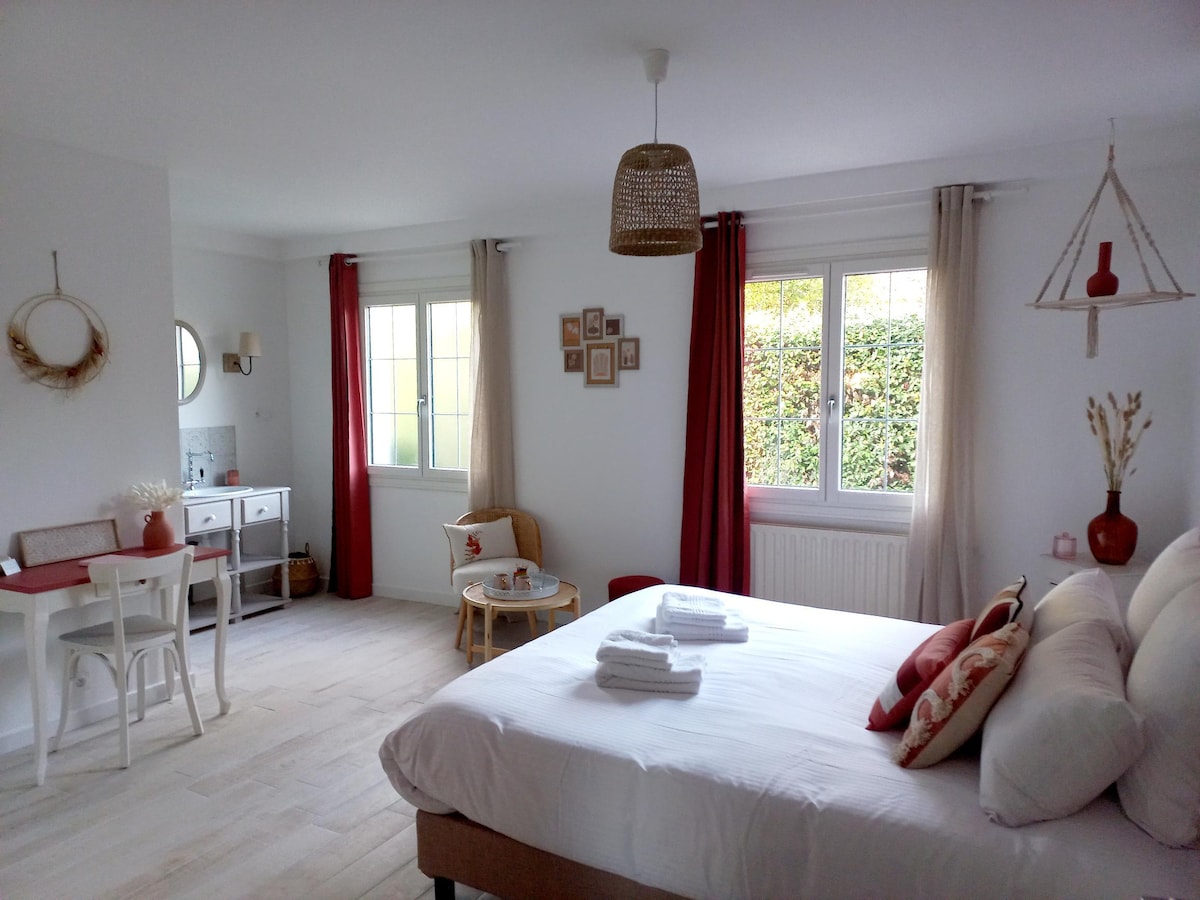 Vores skræddersyede hus byder dig velkommen hele året rundt: Det blå værelse, der er indrettet med omhu, har udsigt over terrassen. (Det grønne værelse, mere rummeligt, står også til din rådighed, hvis det er nødvendigt, se annoncen) For at opdage vores region eller til dine forretningsrejser, slap af i dette unikke, rolige og charmerende sted...