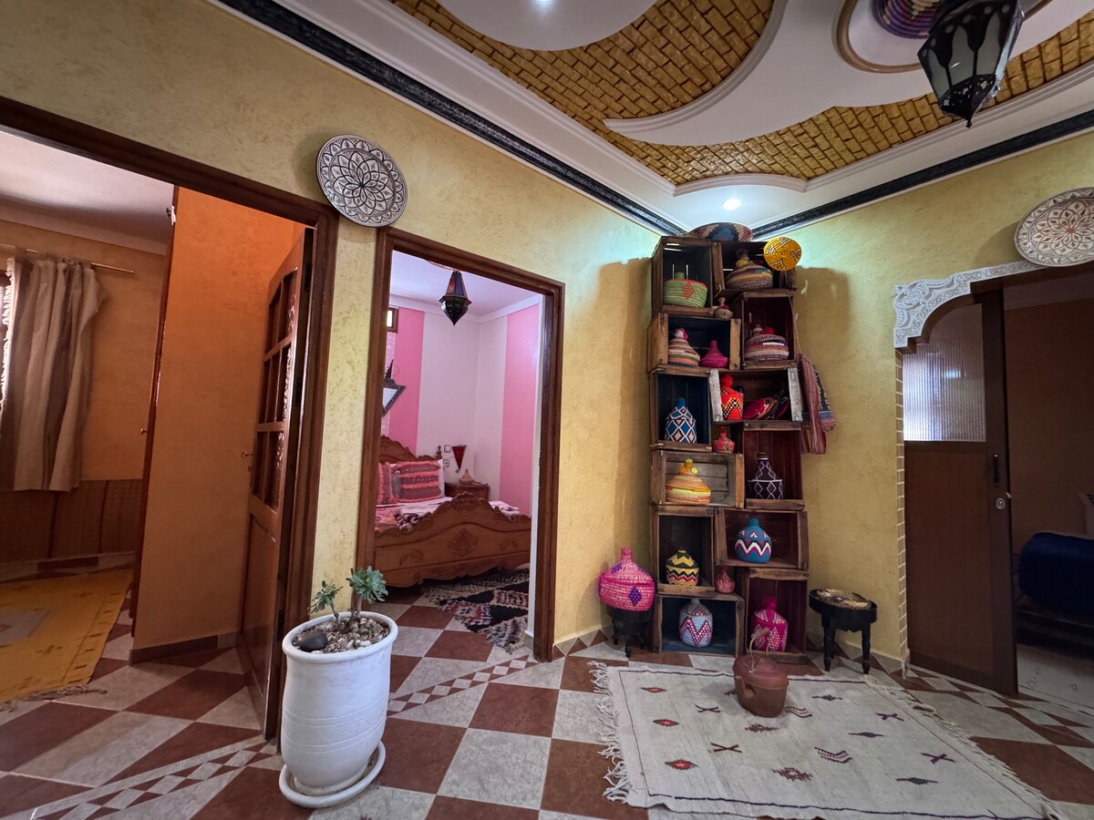 Marion og Said er to forfattere, også kickboksere og for en, psykolog og psykoterapeut og for den anden tidligere direktør for et sociokulturelt center. De byggede dette 600 m2 store hus i én etage på en 25.000 m2 stor grund midt i en arganeskov. Den nærmeste bolig ligger 500 meter væk. Mogador lufthavn ligger 6 km væk, og Essaouira ligger 23 km væk. Huset består af 2 soveværelser og 4 suiter på 45, 55, 70 og 90 m2, en stue på 110 m2 (6 m høj). a/ "TURMERIC"-værelset på 30 m2 med pejs og badeværelse (badeværelse = toilet + håndvask + badekar) (ideelt til 2 voksne + et spædbarn) b/ "MOCHA"-værelset på 35 m2 med pejs, opholdsområde og badeværelse (ideelt til 2 voksne + 1 barn) med aircondition. c/ "SAFRANE"-suiten på 45 m2 med pejs, opholdsområde og badeværelse (2 voksne + 2 børn + 1 baby) d/ "ZARAK"-suiten på 55 m2 med et opholdsområde og dens pejs + en privat terrasse med bænke og bord + badeværelse (2 voksne + 2 børn) eller 4 venner. e/ "BLED"-suiten på 70 m2 med 2 opholdsområder + badeværelse plus (4 voksne + 1 barn + 1 baby) med aircondition. f/ "AZUR" -suiten på 90 m2 med 2 soveværelser + 2 badeværelser + 1 stue (6 voksne) med aircondition. En terrasse, en swimmingpool (ikke tilgængelig i vintersæsonen), et 12 m2 hammam, en boksering og udendørs slående tasker, et bibliotek, haver og terrasser. Køkkenet, traditionelt marokkansk, er tilberedt med økologiske produkter. 5 % af nettooverskuddet doneres til den lokale udviklingsforening Ida o blal ... For at komme til vores hjem skal du transporteres. Vi anbefaler ikke taxaer, der ikke kan lide at tage sporet. Siden januar 2019 er der direkte adgang, og det tager 13 minutter fra lufthavnen (30 minutter fra Essaouira). Den kører 6 km på en ikke-planlagt bane. Med vores Dacia Logan kører vi selv i gennemsnit 50 km/t. Det koster 300 til 450 dirham om dagen afhængigt af sæsonen for en Dacia-lignende lejebil, men det ser ud til, at det er bedre at leje i Marrakech eller Essaouira lufthavn i internationale internetudlejningsbureauer, det er op til dig. Huset er bygget på toppen af en bakke. 360° panoramaudsigten er betagende over omkring femten km. Perfekt sted til et længere ophold omkring læsning, skrivning, meditation eller bare at slappe af omkring poolen og vandfaldet. Til helpension, ud over morgenmad (bestående af hjemmelavet brød, smør, syltetøj, frisk appelsinjuice og varm drik), som allerede er inkluderet i prisen for værelserne, tilbyder vi frokost og middag, med, afhængigt af sæsonen, økologiske grøntsager fra vores have (vores hytte ligger på en grund på 25.000 m2), herunder traditionelle marokkanske retter (en forret, en hovedret og en dessert med en flaske mineralvand og en kaffe eller te med aromatiske urter fra vores have, at vælge imellem) til: 20 euro per voksen for de to måltider ved middagstid (8 euro) og om aftenen (12 euro) 14 euro for børn fra 5 til 13 år (middag 6 euro og aften 8 euro) Gratis for 4 år og derunder. Mulighed for vasketøj for 5 euro per maskine. Poolen er gratis, men hammamen koster et gebyr. Til orientering vil selskaberne TRANSAVIA (Air France/KLM-gruppen) og RAYNAIR nu betjene Essaouira fra Orly, Bruxelles og Marseille (fra 1. marts) Vi er her for at få flere oplysninger. Marion&Saïd