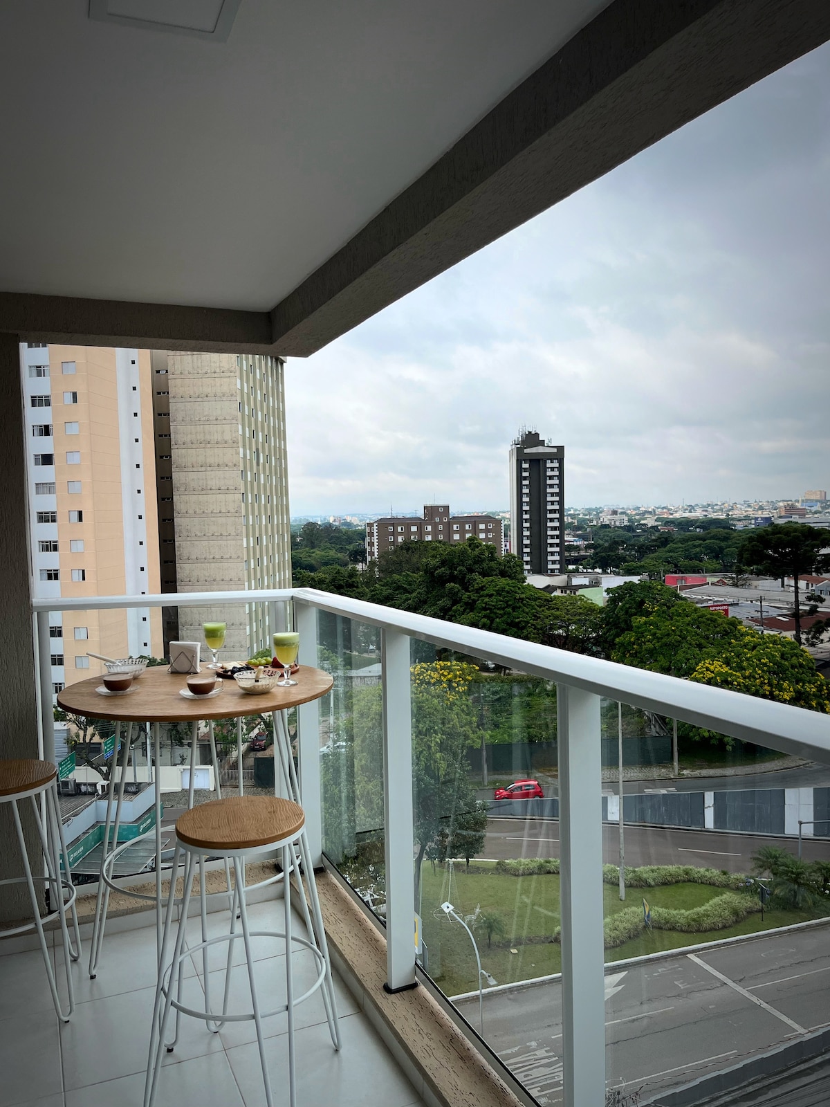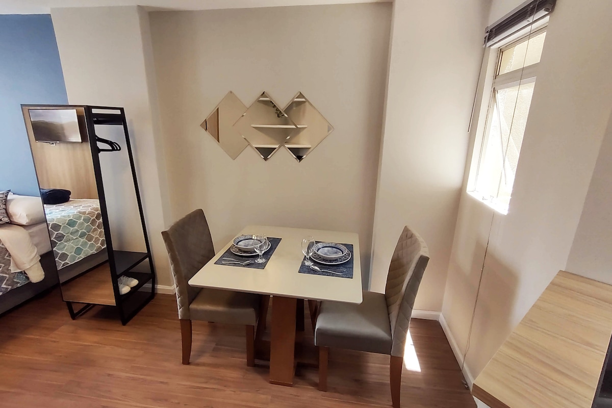 Fuld luksusstudie på 29. etage, Smart stort tv, WI-FI, NET, aircondition, indendørs garage, pool, fitnesscenter, plads til yoga/pilates, sportsbane, udsigtspunkt, poolrum, kontorfællesskab, kontorfællesskab, arbejdsværelse, købmand og marked, alt i bygningen ved siden af shoppingstationen og nem adgang til de vigtigste turiststeder i Curitiba. Den er ideel til et par, men der er plads til yderligere to personer på sovesofaen. Perfekt til det særlige øjeblik!
