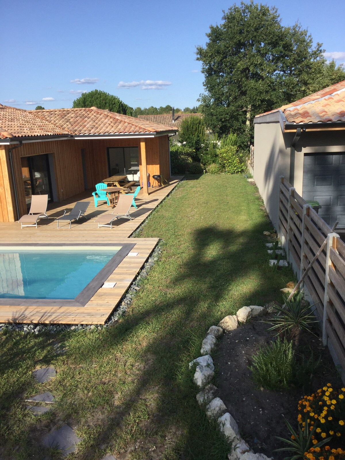 Moderne og varmt hus, meget behageligt at bo i, 70 m2 beliggende i et roligt boligområde. Fri adgang til en lille fælles opvarmet swimmingpool (mellemsæson og sommer). Lacanau-søen ligger 300 m væk. Lacanau-Ville, med butikker og serviceydelser, 2 km. Lacanau-Océan ligger 12 km væk.