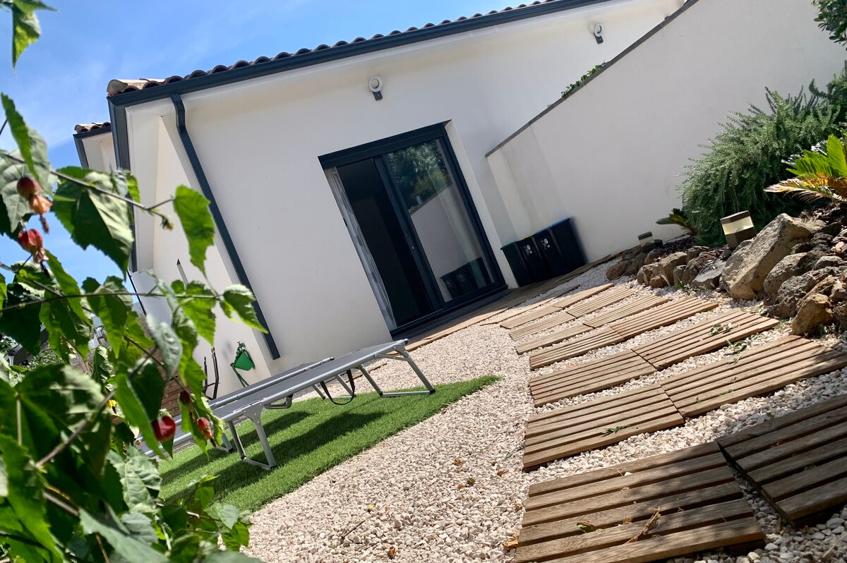 For en ferie eller et stop på vejen til Spanien F1-eniveau på 25 m2 med aircondition, der støder op til vores villa med egen indgang samt sin intime PRIVATE HAVE. Din bil vil blive parkeret i vores indkørsel (elektrisk port). Et soveværelse med en 140/200 queensize-dobbeltseng adskilt af et glastag, Fuldt udstyret køkken (mikrobølgeovn, induktionskomfur osv.) tV-lounge med 140/190 sovesofa Badeværelse (brusebad) toilet. Du har en have, bord, liggestole, elektrisk plancha.