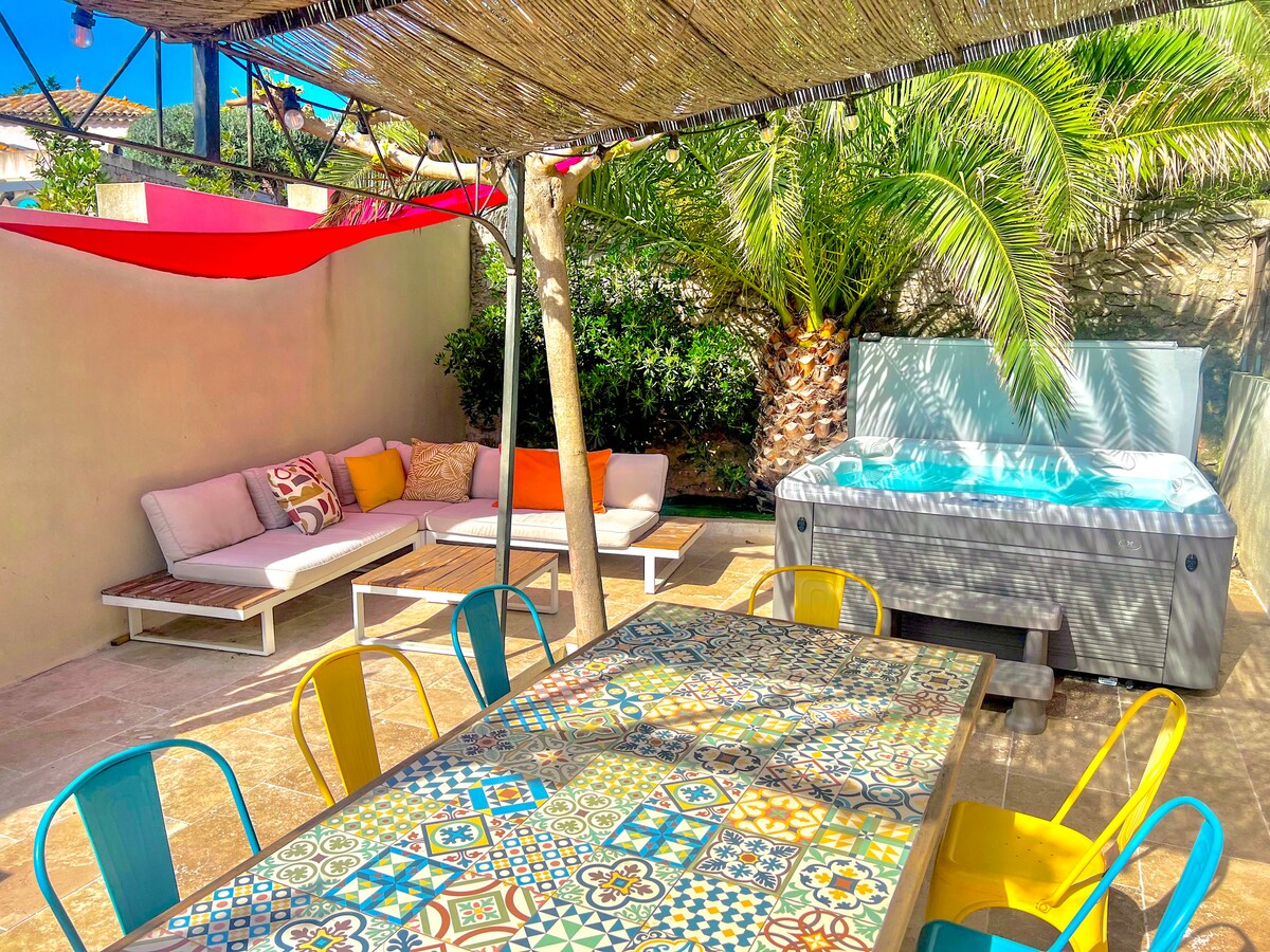 På Sète, i hjertet af Corniche-distriktet, tæt på butikker og 400 meter fra stranden, type 2 lejlighed (udhusbygning på havegulvet i vores villa) på ca. 40 m2 fuldt udstyret med den største fordel ved vores ejendom: en stor uhindret terrasse med en lille privat pool på 10 m2, jacuzzi og grill til din rådighed. Parkering foran huset er gratis, og ejendommen har egen indgang. Stille og privatliv til din ferie.